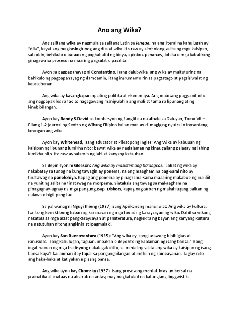 DARUNDON AT MARY MAE AMBAG Ang wika ay isang asistemang balangkas ng sinasalitang tunog na pinipili at isinasaayos sa paraang arbitraryo upang magamit ng mga tao sa kabilang ng isang kultura Ang Wika sa simpleng pagpapaliwanag ay ang kalipunan ng mga salita na ginagamit ng isang lipunanBawat lipunan sa daigdig ay may wikang. May sistema ang wika sa palatunugan ponolohiya palabuuan morpolohiya at palaugnayan sintaks. Morpema ang tawag sa pinakamaliit na yunit ng.
