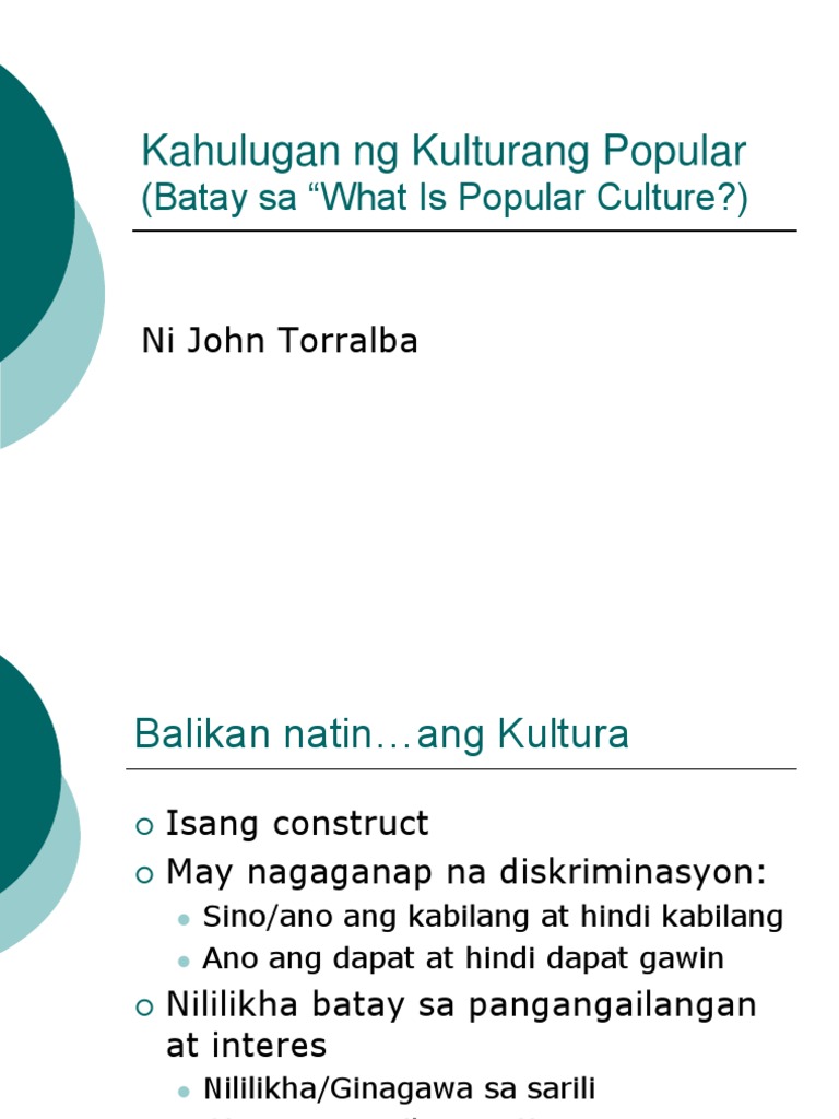 Apr 21 2013 Tumutulong ang kulturang popular dito dahil pinapaalam ng mga tao kung ano ang mabuti at kung ano ang hindi. Ni John Enrico C. Kahulugan ng Kulturang Popular Batay sa What Is Popular Culture Ni John Torralba Balikan natinang Kultura.