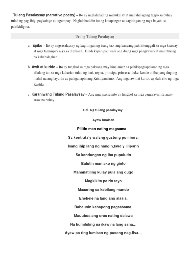 Tulang Pasalaysay Narrative Poetry Ito Ay Naglalahad Ng Makukulay At Mahahalagang Tagpo Sa Buhay