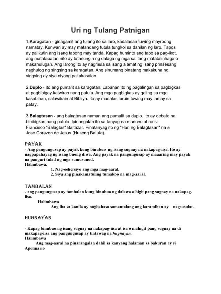 Mga uri 1Karagatan - ginagamit ang tulang ito sa laro kadalasan tuwing mayroong namatay. Uri Ng Tulang Patnigan. Ito ay may tatlong uri.