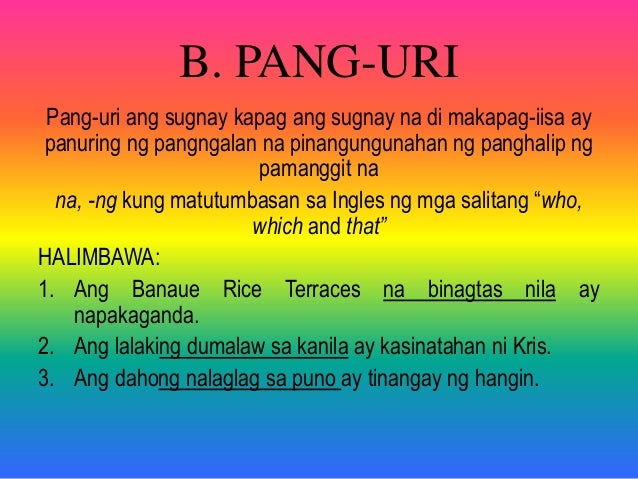 27072010 Mga Uri ng. Paturol ipinahahayag ng uring ito ng pangungusap ang isang katotohanan o kalagayan ayon sa paraan ng. PANG-URI Pang-uri ang sugnay kapag ang sugnay na di makapag-iisa ay panuring ng pangngalan na pinangungunahan ng panghalip ng pamanggit na na -ng kung matutumbasan sa Ingles ng mga salitang who which and that HALIMBAWA.
